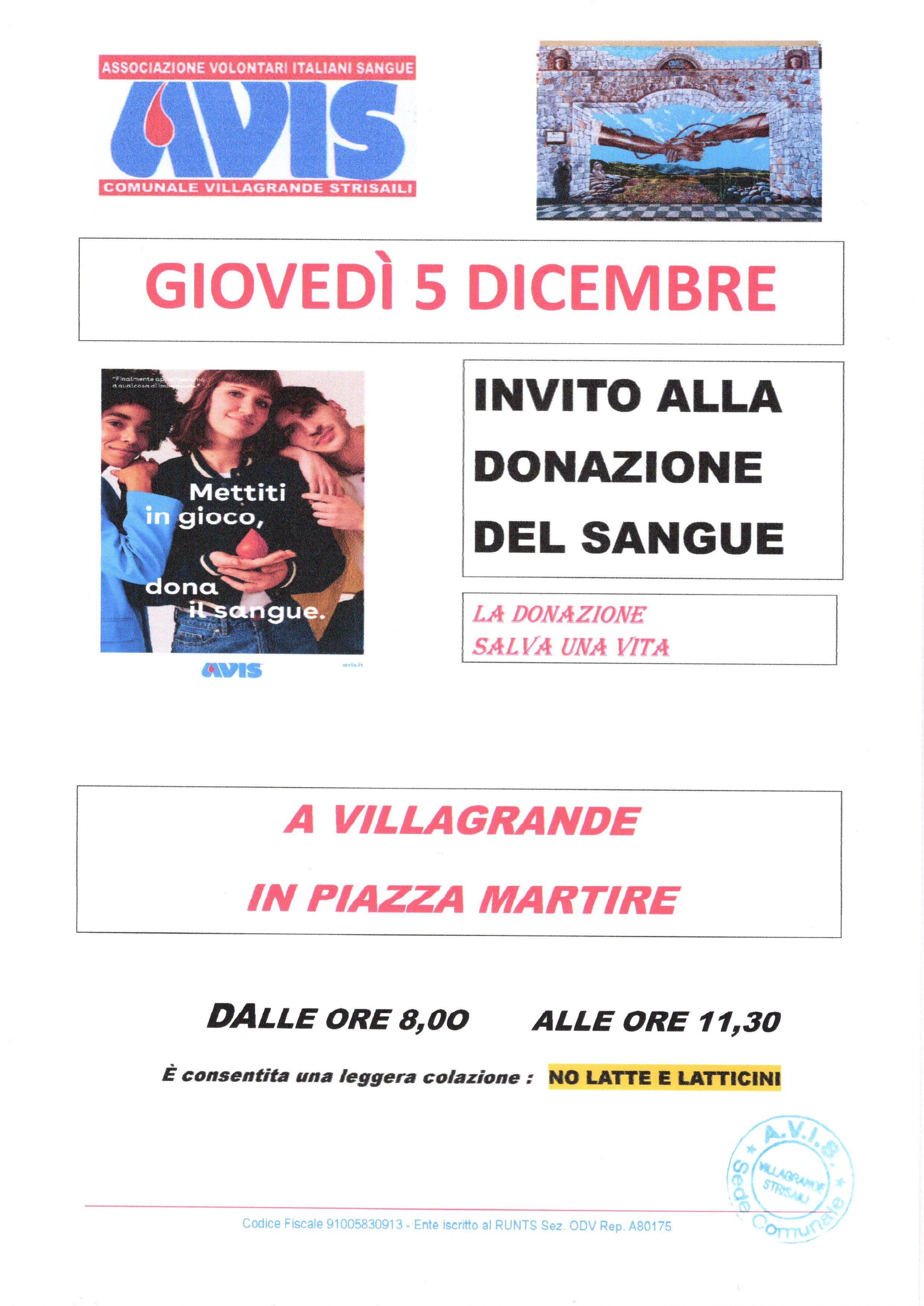 l’Avis Comunale di Villagrande - Villanova Strisaili, organizza per GIOVEDI' 5 DICEMBRE 2024 una raccolta sangue con l’ausilio dell’autoemoteca del Centro Trasfusionale dell’Ospedale di Lanusei che sosterà a Villagrande in Piazza Martini dalle ore 8,00 alle ore 11.30.