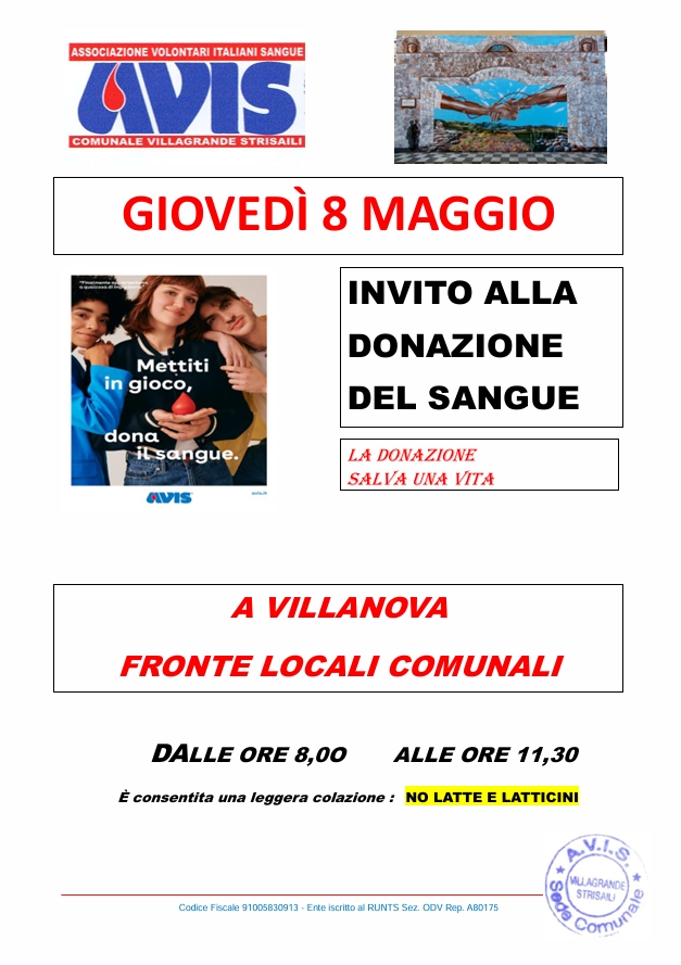 L’A.V.I.S. Comunale organizza per GIOVEDI' 8 MAGGIO 2025 una raccolta sangue con l’ausilio dell’autoemoteca del Centro Trasfusionale dell’Ospedale di Lanusei che sosterà a Villanova fronte locali comunali dalle ore 8,00 alle ore 11.30.