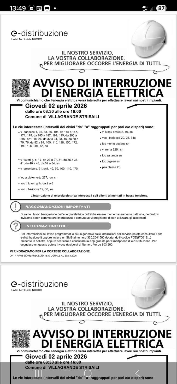 Enel-distribuzione avvisa che l'energia elettrica verrà interrotta per effettuare lavori sugli impianti che alimentano le tue forniture situate agli indirizzi di seguito indicati.